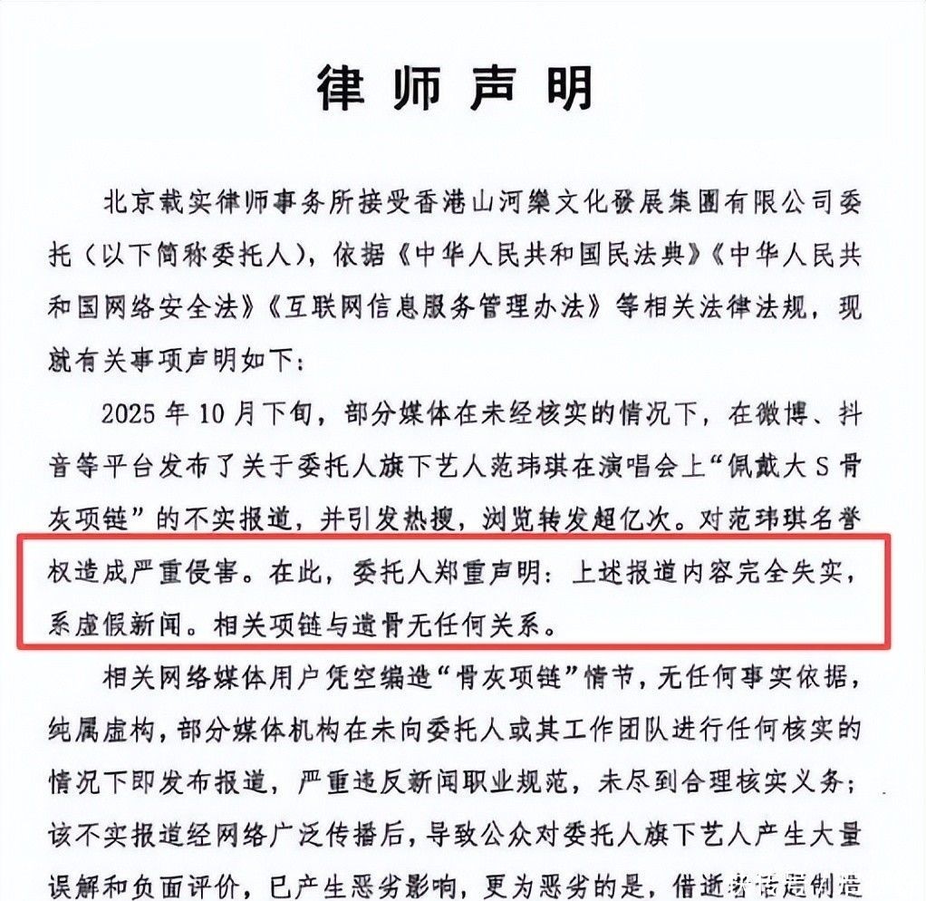 事件发酵后,范玮琪经纪团队迅速采取法律手段,委托律师事务所发布严正声明,明确指出该内容纯属捏造,所谓“骨灰项链”与事实完全不符,相关饰品仅为普通珠宝设计,与遗骸毫无关联。